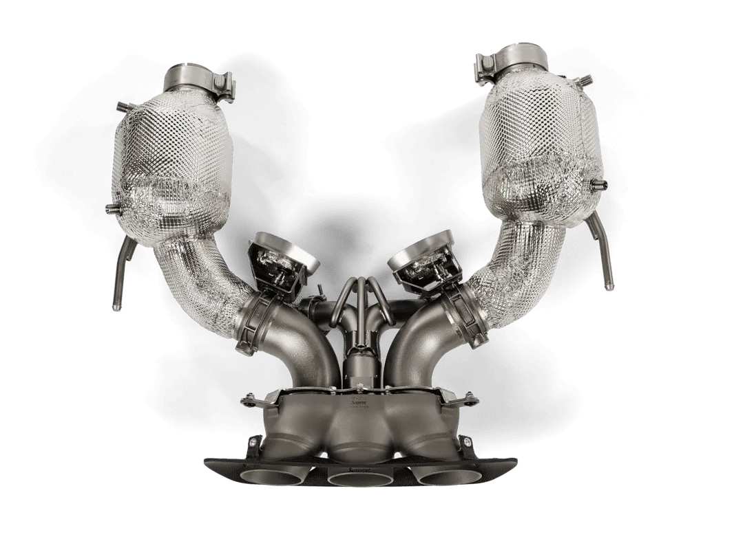 Des matériaux éprouvés en course ont été utilisés pour créer ce système d’échappement tout en titane destiné à la piste , offrant une économie de poids de 3,6 % (-0,4 kg) par rapport à la version standard. Deux convertisseurs catalytiques sport de 200 cpsi remplacent deux filtres à particules essence pour un flux de gaz plus direct et deux soupapes – avec boîtier moulé dans la fonderie interne – ont été conçues pour fournir un grondement profond et résonnant au démarrage et une tonalité de course lorsque le régime du moteur V6 à 120° augmente.