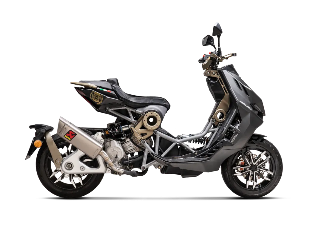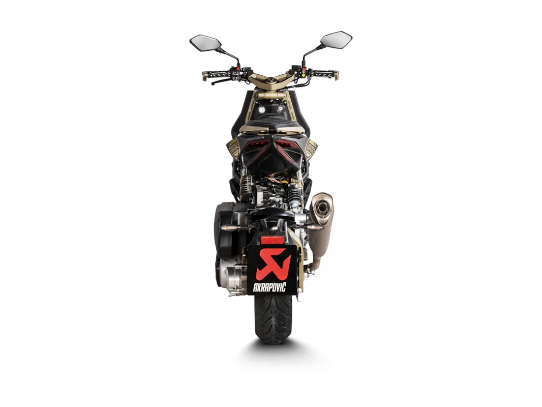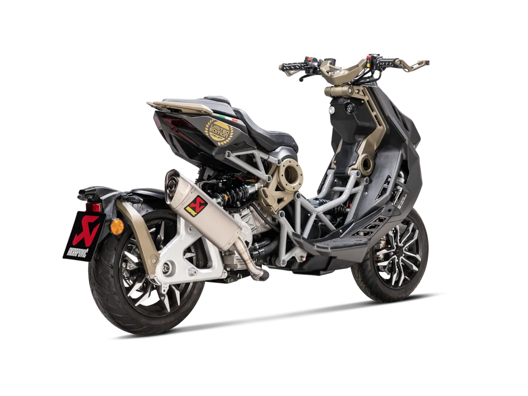Adoptant un design typique du monde du superbike, cet échappement est doté d’un manchon extérieur léger en titane et d’un embout qui confèrent une allure sportive aux lignes de la « superbike urbaine », nom donné à ce scooter. Un collecteur en acier inoxydable complète le système, offrant un gain de poids considérable de 67,1 % (3,9 kg) par rapport à l’échappement d’origine.