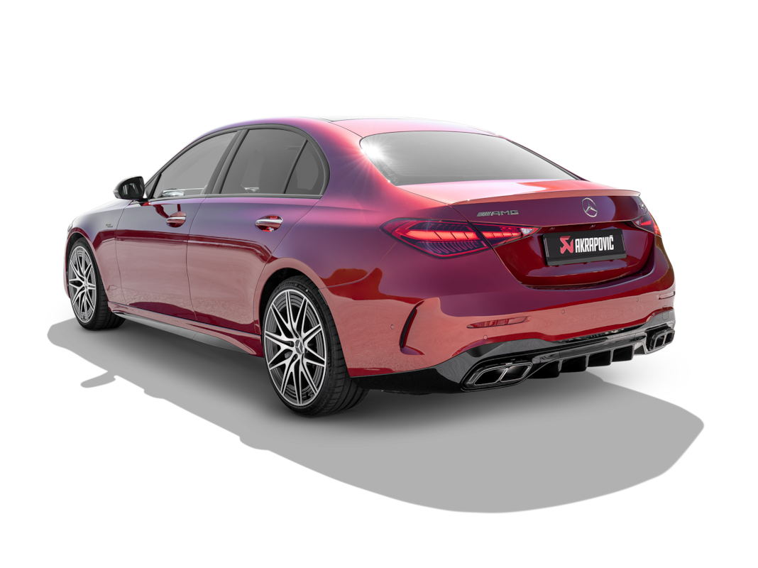 Cet échappement entièrement en titane de haute qualité est complété par une double paire de sorties d’échappement montées sur le pare-chocs, avec des manchons extérieurs en fibre de carbone fabriqués à la main et des manchons intérieurs en titane. Des collecteurs spéciaux à l’intérieur des deux silencieux éliminent les bruits de ruissellement, tandis que des cônes intérieurs agissent comme des réflecteurs acoustiques pour diriger partiellement le son des sorties d’échappement vers l’habitacle. Le son est linéarisé en fonction de la charge et du régime moteur. Doux et raffiné à vitesse de croisière, il devient plus sportif et plus intense en conduite dynamique. Le son est contrôlé par deux soupapes d’échappement et un kit de contrôle, qui surveille les paramètres de conduite et contrôle précisément l’ouverture et la fermeture des soupapes pour créer un son distinctif et précis. La puissance est augmentée de 7,1 kW (9,6 ch) à 2 000 tr/min, et un gain de couple de 33,7 Nm à 2 000 tr/min a été obtenu lors d’un essai sur le banc Akrapovič avec une Mercedes-AMG C 63 SE PERFORMANCE équipée d’un échappement d’origine. Le poids est réduit de 26,8 % (3,7 kg) par rapport à l’échappement d’origine standard.