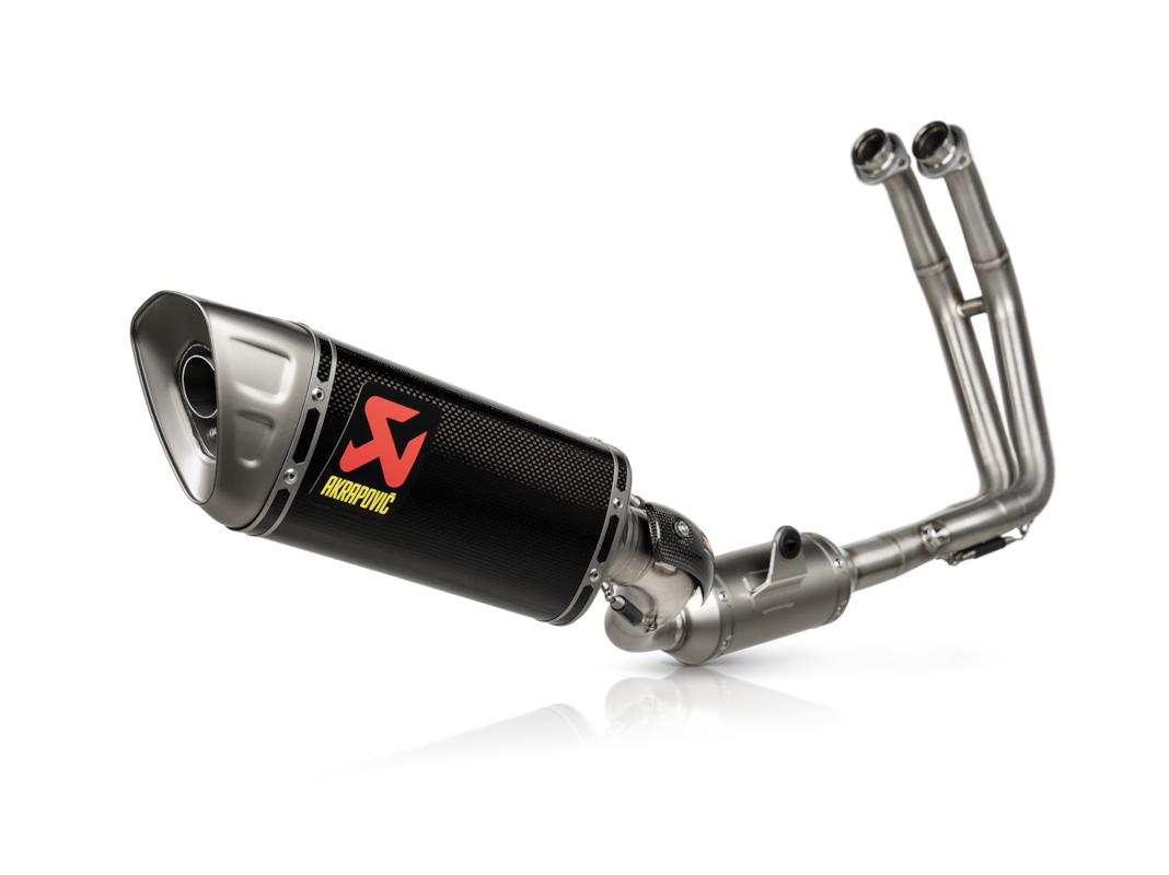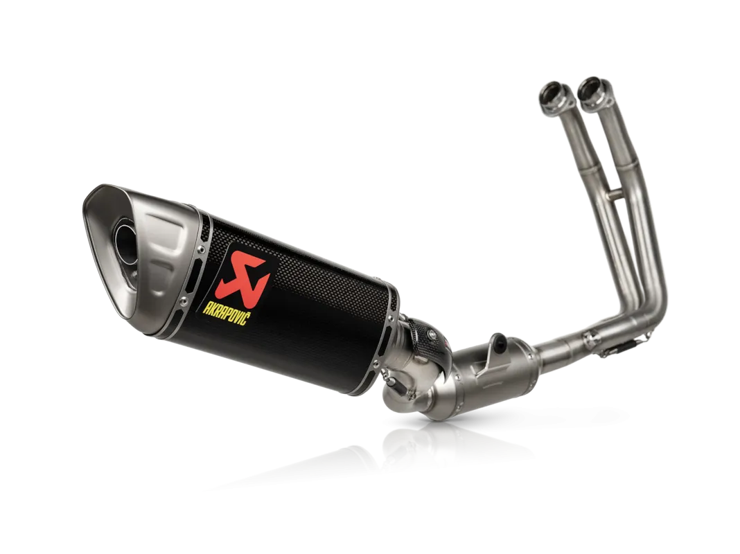 Il s’agit d’un tout nouveau système d’échappement, conçu de toutes pièces et fabriqué à partir de matériaux légers et éprouvés en compétition . Un manchon extérieur de silencieux, un écran thermique et un collier en fibre de carbone , un embout en titane, un collecteur, un résonateur et un tube de liaison en acier inoxydable, ainsi qu’un support de silencieux en aluminium noir, permettent un gain de poids de 39,6 % (3,2 kg) par rapport à l’échappement d’origine.